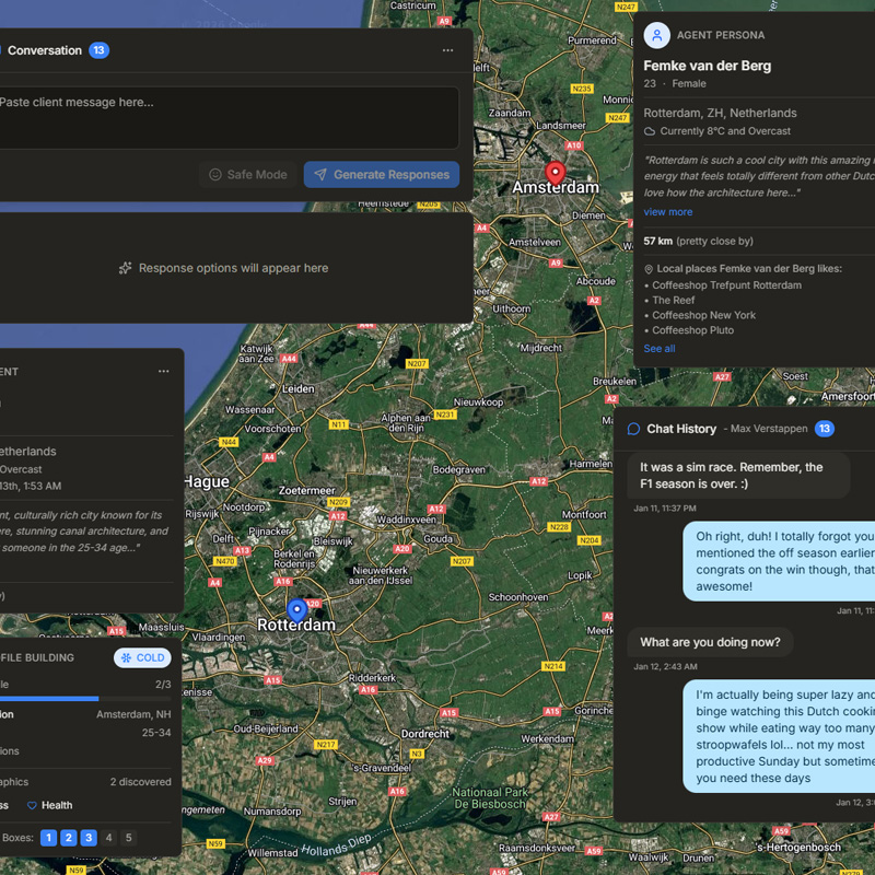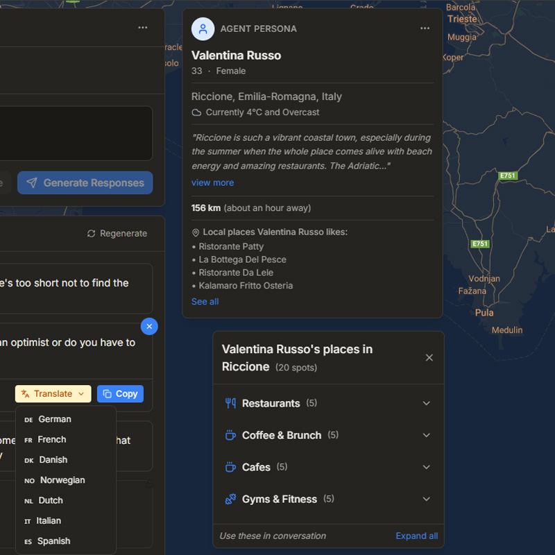 Create authentic personas with real locations, local weather, and nearby places for believable conversations.